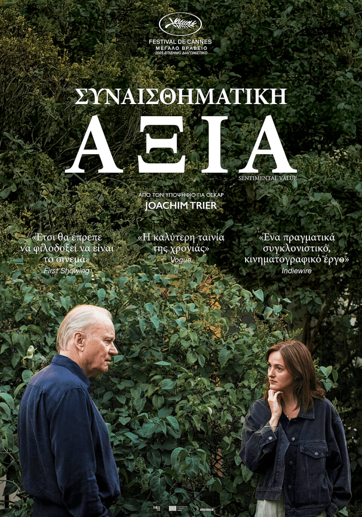 Το Sentimental Value του Joachim Trier είναι ένα έργο που αποκαλύπτεται αργά, σαν βιβλίο που το ξεφυλλίζεις με δέος. Η ταινία ανοίγει με μια σκηνή σχεδόν ποιητική: ένα παιδί γράφει για το σπίτι του σαν να ήταν έμψυχο ον, που χαίρεται ή πονά. Στη συνέχεια, μια ηθοποιός (η Νόρα της Renate Reinsve) καταρρέει πριν βγει στη σκηνή. Από εκεί και πέρα, η αφήγηση κινείται μεταξύ σπιτιών, θεάτρων, κινηματογράφων, φεστιβάλ· τόπων όπου το ιδιωτικό συναντά το συλλογικό και το τραύμα συναντά την τέχνη. Στην καρδιά της ιστορίας βρίσκεται η σχέση πατέρα-κόρης.